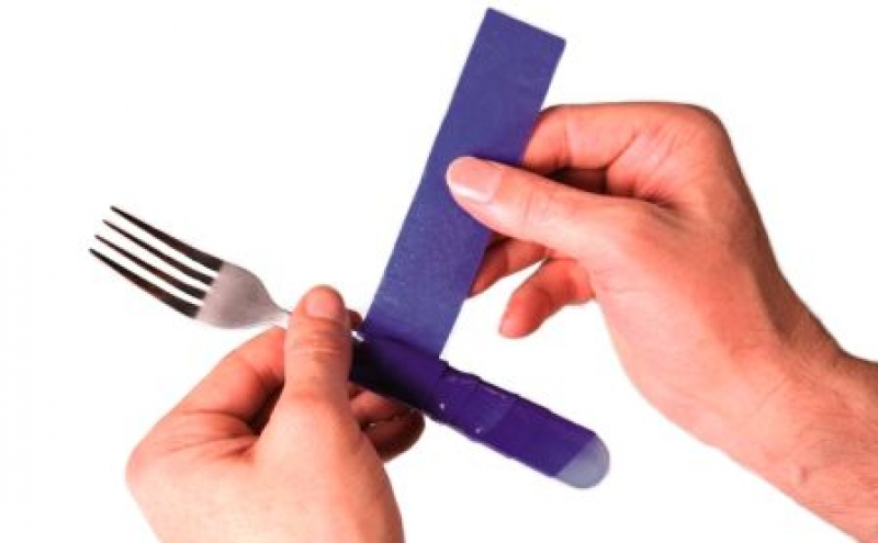 Die Streifen lassen sich ebenso wie das aufgerollte Material zuschneiden und um Gegenstände wie Besteck, Stifte, Stöcken, Gehhilfen oder auch an Lehnen von Rollstühlen Werkzeuge wickeln.