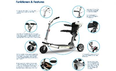 Der komfortable E-Scooter sieht nicht nur sportlich aus, sondern bietet auch höchsten Fahrkomfort auf kurzen und längeren Strecken. Ob zum Einkaufen auf den Wochenmarkt, auf Ausflügen oder im Urlaub: der ATTO lässt sich in nur 10 Sekunden platzsparend zusammenklappen und passt so problemlos in jeden Kofferraum.