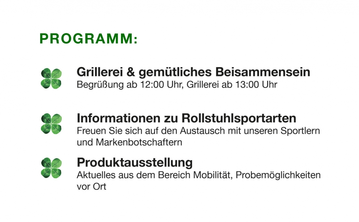 Am 3. Oktober 2025 findet der nächste GEORG EGGER Mobilitätstag statt. Wir laden alle Privatkunden sowie Mitarbeiterinnen und Mitarbeiter aus Gesundheitseinrichtungen herzlich dazu ein. Austausch, gemütliches Beisammensein, Produktausstellungen und Informationen zu Rollstuhlsportarten, stehen am Programm. Wir starten um 12:00 Uhr mit der Begrüßung, ab 13:00 Uhr wird gegrillt.