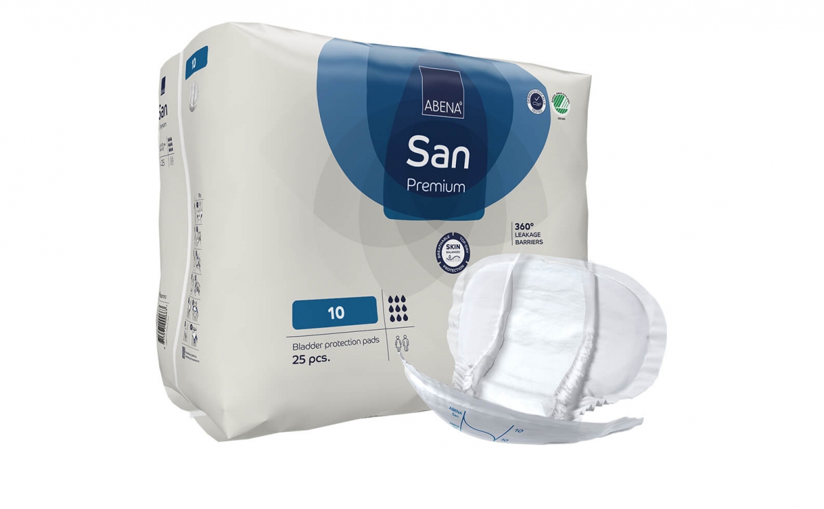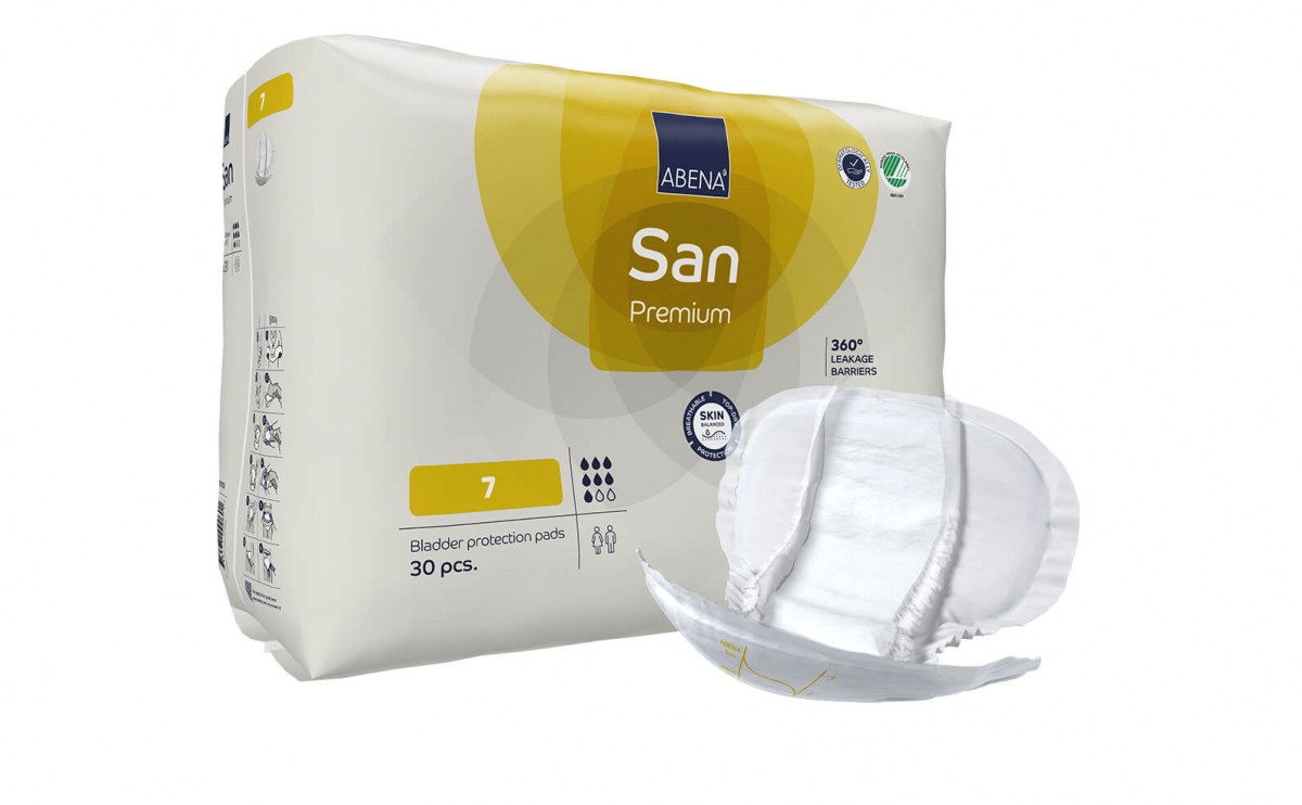 Die anatomisch geformten Einlagen des Premium-Sortiments von Abena San 5-11 sind atmungsaktive Einlagen die dem Anwender maxmimalen Komfort, Schutz und Diskretion bieten. Die spezielle Materialzusammensetzung (Top-Dry-System) sorgt für eine schnelle Absorption und eine trockene Oberfläche. Seitliche Barrieren bieten einen zusätzlichen Auslaufschutz und das Anti-Geruchsystem neutralisiert unangenehme Gerüche.